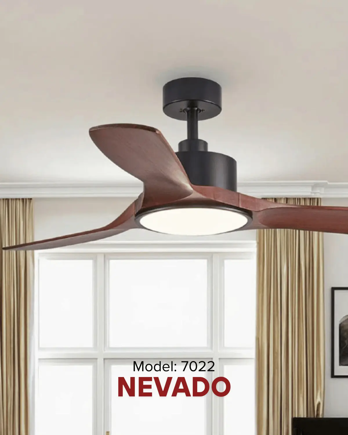 NEVADO LED Ø52 sở hữu kiểu dáng tối giản với 3 cánh quạt cong mềm mại, mang lại cảm giác nhẹ nhàng và sang trọng. Bề mặt được hoàn thiện sơn tĩnh điện cao cấp, chống bám bụi và dễ vệ sinh. Kích thước Ø52” (1320 mm) giúp sản phẩm phù hợp với các không gian có diện tích 12–20 m² như phòng ngủ, phòng đọc sách, hoặc phòng khách nhỏ.